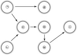 - 정점이 작업을 나타내고 그 간선이 작업간의 우선 순위 관계를 나타내는 방향 그래프. 주목적은 위상적 순서(topological order)를 찾아내는 것이며, 이 때문에 순차적 작업을 요하는 부품 조립(선박, 비행기) 등의 분야에서 많이 응용되고 있다.선행자(predecessor)란 어떤 작업을 하기 전에 해야 하는 작업을 말하는데, 위의 그래프의 경우 ㉣작업을 하기 전에 ㉠작업을 먼저 해야 하고, ㉤작업을 하기 전에 ㉠,㉡,㉢작업을 먼저 해야 한다. 이 때 ㉢작업은 ㉤작업의 즉각 선행자(immediate predecessor)라고 한다. 후행자(successor)란 어떤 작업 다음에 해야 할 작업을 의미하고, 예를 들면 ㉢작업을 한 후엔 ㉤,㉥,㉦작업을 해야 한다. 이 때 ㉤작업은 ㉢작업의 즉각 후행자(immediate successor)가 된다.